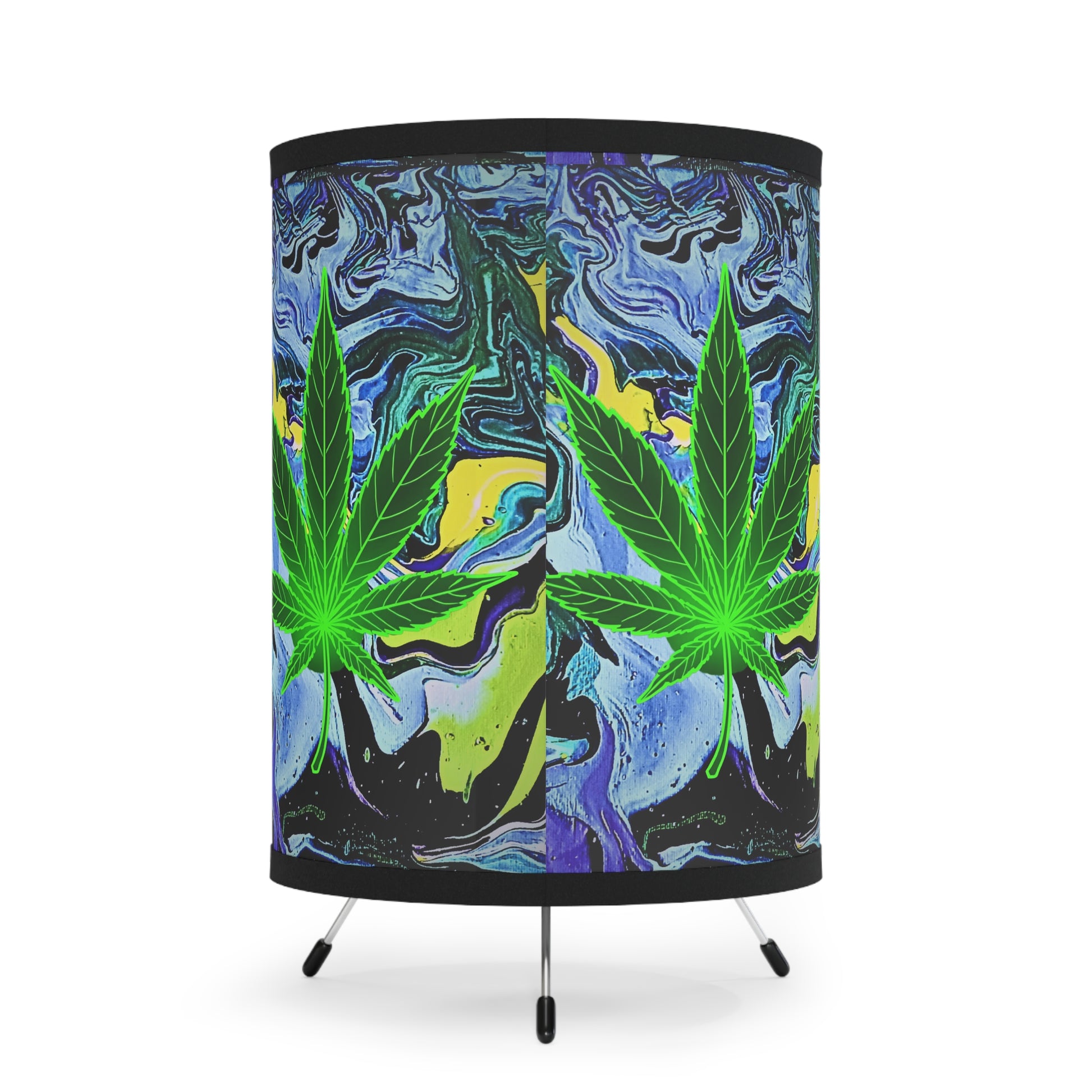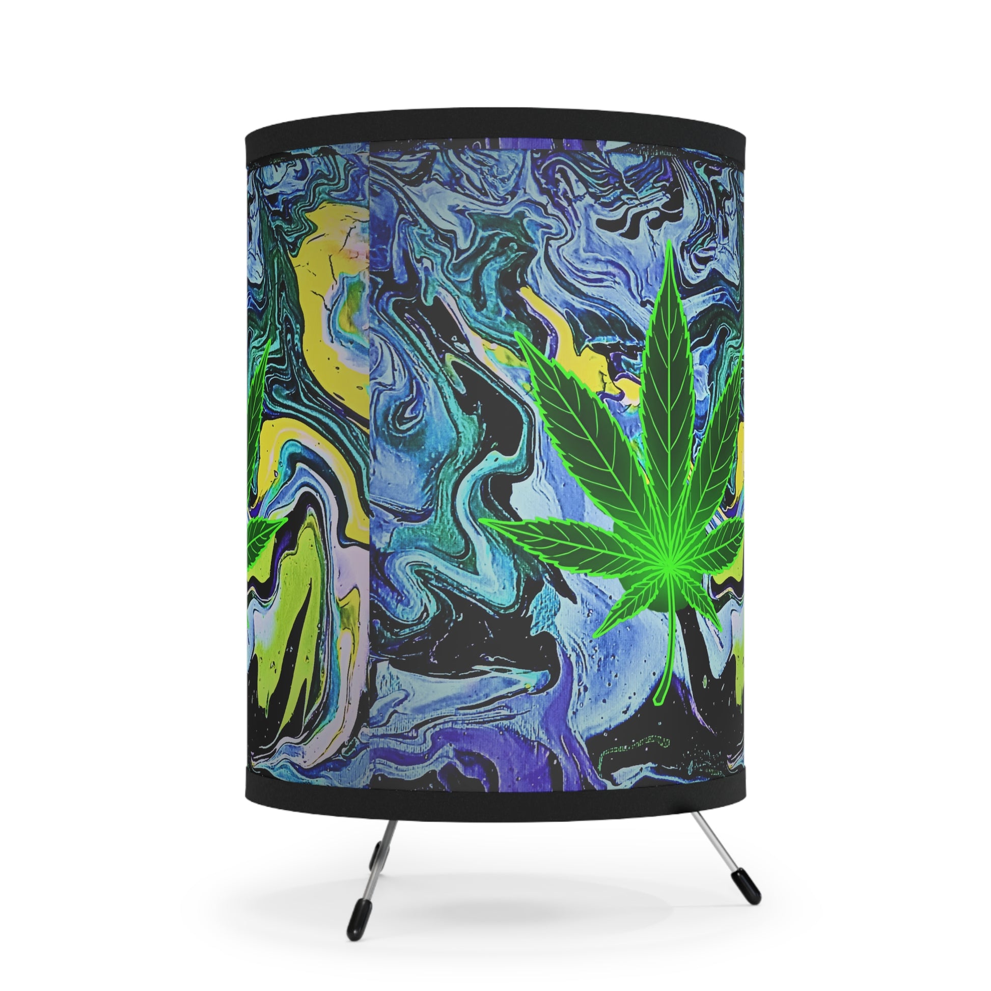 This tripod lamp brings laid-back, bohemian energy into any room. The high-resolution printed shade wraps a bold, marbled backdrop in electric blues, greens and yellows, while a vivid cannabis leaf motif sits front and center—a statement piece that casts warm, ambient light and a chill, creative vibe. The slim galvanized steel tripod keeps the lamp feeling airy and modern, letting the print take focus. It’s the kind of light you leave on for late-night art sessions, relaxed hangouts, or when you want your living space to feel more personal and expressive.